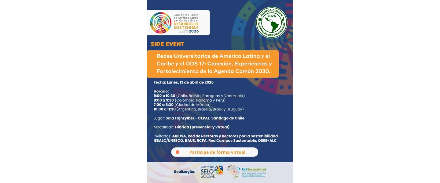 El objetivo de este evento será presentar y dar visibilidad a las redes universitarias de América Latina y el Caribe que trabajan en la implementación de la Agenda 2030, con énfasis en el ODS 17. Permitirá dar visibilidad a las principales redes universitarias latinoamericanas centradas en la sostenibilidad y compartir experiencias prácticas sobre la institucionalización de la Agenda 2030 en instituciones de educación superior. De esta manera, se espera fortalecer la conexión entre las redes nacionales y regionales, ampliar el reconocimiento de la Agenda Común como espacio de articulación estratégica y destacar el papel de las universidades como plataformas de cooperación territorial.